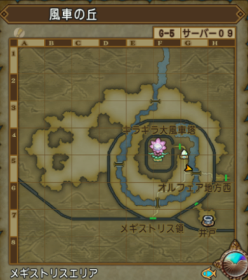 | 風車の丘 | バシっ娘で「プクランド大陸」⇒「風車の丘・大風車塔前」 初めて行くときは、 大陸間鉄道で「メギストリスの都駅」⇒「メギストリス領」⇒「風車の丘」 釣り場は【G-5 川】 バシっ娘で「プクランド大陸」⇒「風車の丘・大風車塔前」に飛んだところにある川。 飛んですぐは川まで距離があって魚釣りができない為、南の橋の辺りまで少し歩く。 |