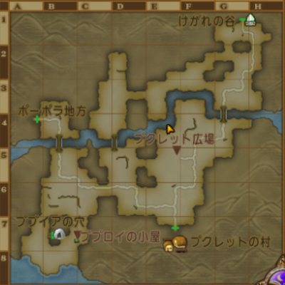 | プクレット地方 | 【G-3の川】の行き方 バシっ娘で「プクランド大陸」⇒「けがれの谷」に出て南に歩く。 釣り場はマップの中央に流れる川。 若干距離がある。 【B-8南西の海】の行き方 バシっ娘で「プクランド大陸」⇒「プクレットの村」から外に出て西に歩く。 若干距離がある。 |
