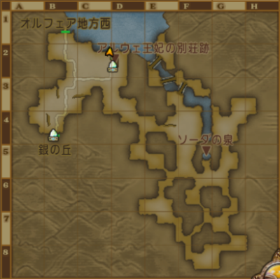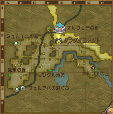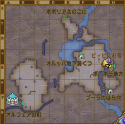 | オルフェア地方東 | 【G-5の川】 バシっ娘で「プクランド大陸」⇒「ピィピのお宿」飛んですぐ。 釣り場までとっても近い。 【F-2の川上流】 バシっ娘で「プクランド大陸」⇒「ピィピのお宿」飛んで北へ歩く。 釣り場までちょっと距離がある。 イワナが釣れやすい。 【B-6の池】 バシっ娘で「プクランド大陸」⇒「オルフェアの町・東」から町の東の外へ、 外に出てすぐ北にある池。 釣り場まで近くて便利。フナがレア度★で釣りやすい。 同じような池でも、右下の池はG-5の川と同じ魚が生息している。 |