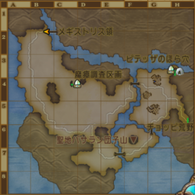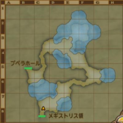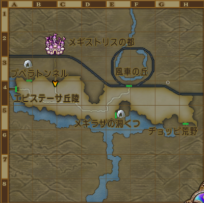 | メギストリス領 | バシっ娘で「プクランド大陸」⇒「メギストリスの都・入口」に飛んでからそのまま町の外へ。 初めて行くときは、 大陸間鉄道で「メギストリスの都駅」⇒「メギストリス領」 釣り場【B-5 の川付近】の行き方 メギストリスの都から外に出てまっすぐ南。 釣り場【G-5 の川】の行き方 メギストリスの都から外に出てひたすら東に走る。 ピンポイントでこの付近だけ釣れる魚が違う。 |