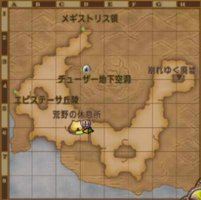 | チョッピ荒野 | バシっ娘で「プクランド大陸」⇒「荒野の休憩所」 初めて行くときは、 大陸間鉄道で「メギストリスの都駅」⇒「メギストリス領」⇒「チョッピ荒野」 釣り場は【B-6 海】 「荒野の休憩所」に飛んで南西に少し歩く。 |