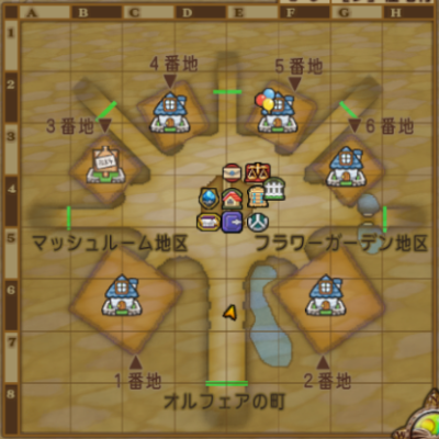 | トゥーンタウン地区 | バシっ娘で「プクランド大陸」⇒「オルフェアの町・東」 E-3の住宅村から中に入る。 釣り場は入ってすぐ右(E-7池) |